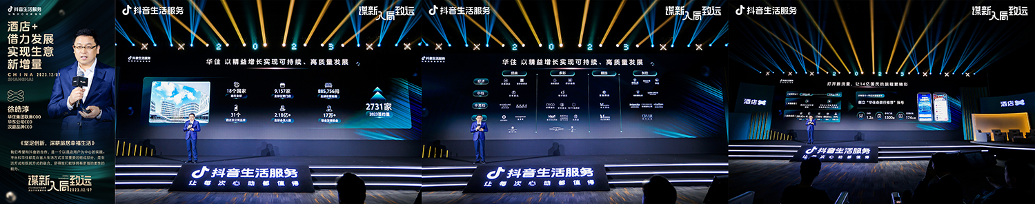 华住集团联席COO/华东公司CEO/汉庭品牌CEO徐皓淳,以“坚定创新,深耕旅居幸福生活”为题展开讲述。徐皓淳指出:“华住集团旗下的汉庭酒店历经十八年走进了超过1000个城市,庞大的经营规模之下,也有运营上的短板。入驻抖音生活服务后,打开新流量,通过与抖音生活服务在旅行囤货节中的合作,短视频+直播收获交易额超1.2亿元”。2024年,汉庭酒店将与抖音生活服务进行全方位合作,带动交易规模增长,成就美好生活。