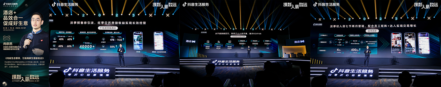 “想要好生意被看见、被放大,需要做内容,更需要持续不断地做好内容。”抖音生活服务酒旅业务副总裁项问天指出:“未来平台将做好基建,共同进化,持续投入建设内容生态、产品能力、营销提效、经营指导4大板块,助力酒店好生意”,“在抖音做酒店生意,现在是最好的时机”。