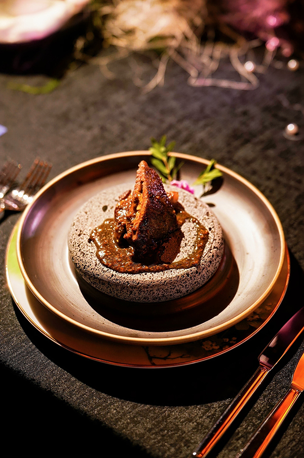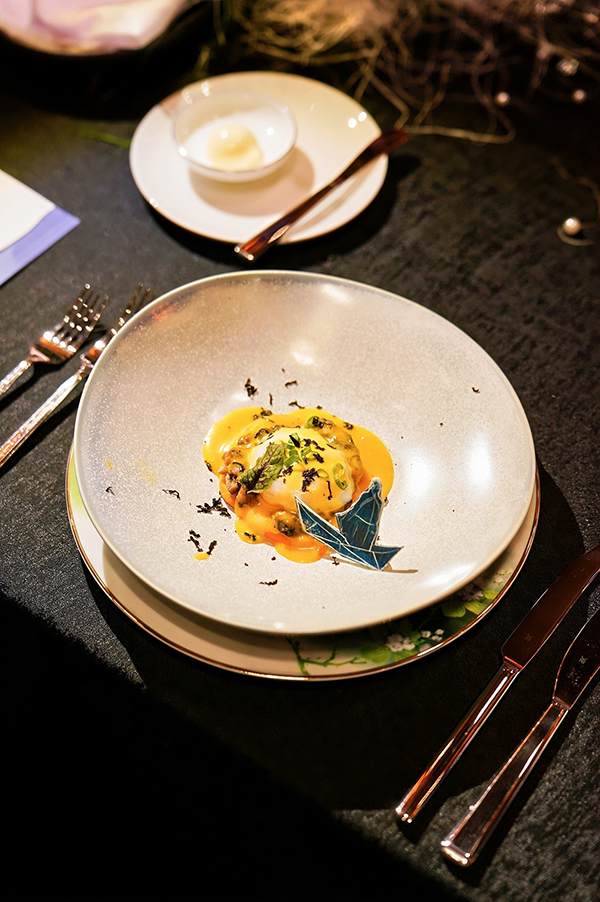 美高梅酒店运营总监邹靓(Percy Zou),深耕餐饮行业三十余载,创作「林间拾野」。灵感取自东坡“粗中见细,化俗为雅”的烹饪理念。以野山菌煎饼、温泉蛋等寻常食材为底,巧佐黑松露与陈年花雕奶黄汁提味,于平凡中造丰雅,寄寓东坡于坎坷中自寻欢愉的达观。