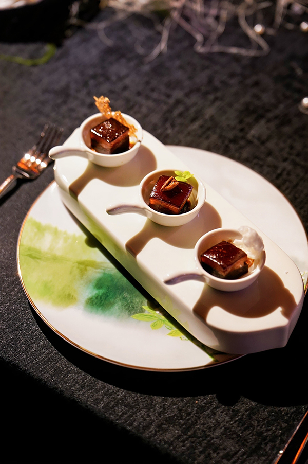 一方山川,三处心迹。李涛(上海苏宁宝丽嘉酒店 中餐行政总厨)以“时令为纲、匠心为本”的烹饪哲学为念,创作「三味东坡肉」,灵感起于三地风物——眉州麻辣热烈、杭州烟笋清雅、儋州黄皮微酸。三碟并列,三味自成:如东坡一生的境遇与心绪——由浓至淡,由喧入静。李师傅以诗的方式烹调肉香,把文人的旷达与趣味,一并留在舌尖。