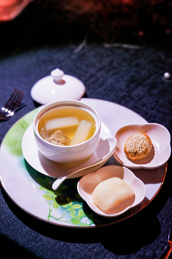 拾久 Poetry & Wine 与茉 MO·Jasmine 创始人张芊(两品牌均荣获米其林一星),以东坡嗜羊之趣为脉络,呈献「温露润玉酥」。取清炖羊肉之本味,辅以当归、黄芪、桂圆温润提气,汤澄味醇;同席“东坡饼”承其所赞环饼之酥与艳,再配以“呛腌莱阳秋月梨”添凉添甘。一汤一饼一清口,清醇、酥香、甘润交织,尽显东坡式丰味与雅致。